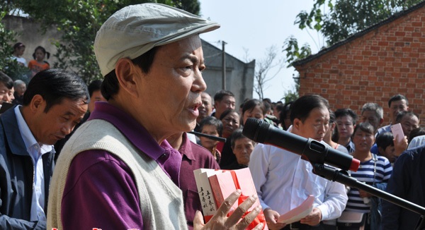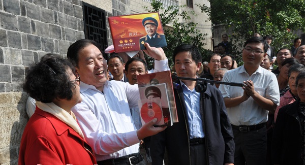 徐海东大将之女、北京开国元勋文化促进会会长徐文惠(图左一)向红安县赠送相关书籍和影像资料。