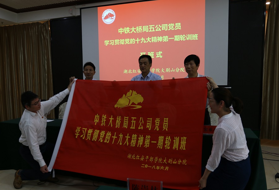 2018年6月3日,在庄严的国歌声中,中铁大桥局五公司党员学习贯彻党的十九大精神集中轮训第一期培训班在湖北红安干部学院大别山分院正式开班,揭开了五公司党员学习轮训的序幕。开班仪式上,湖北红安干部学院大别山分院党支部书记龚光芬致欢迎词,他指出,红安是著名的革命老区,是“黄麻起义”的策源地,是鄂豫皖革命根据地的“红色首都”,是中国工农红军三大主力之一的红四方面军诞生地,蕴含的历史文化价值在全国具有广泛的影响,希望大桥局学员同志们能认真学习,学有所获。