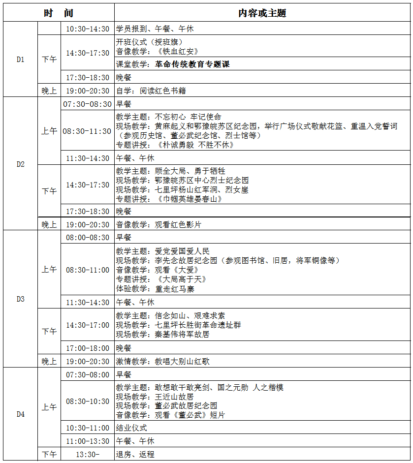 湖北大别山革命传统教育基地四天班课程安排