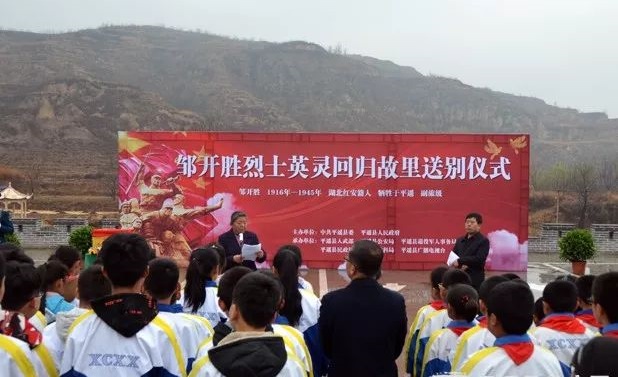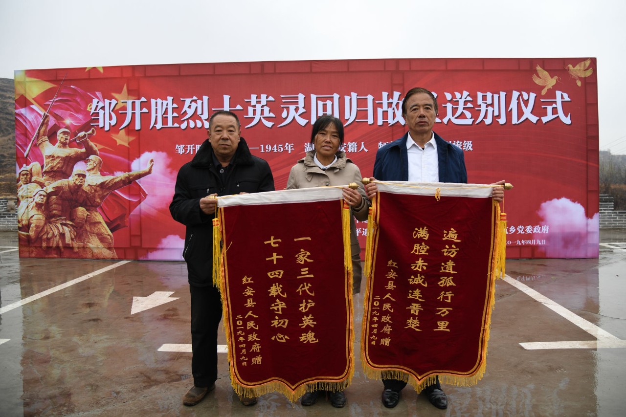 4月9日上午9时,邹开胜烈士英灵回归故里送别仪式在平遥县朱坑乡丰盛村举行。邹开胜烈士亲属、部队领导、红军西路军研究工作委员会、湖北省红军精神研究专业委员会、山西平遥县邹开胜烈士守护人贾林香夫妇以及红安县领导等200余人迎接烈士魂归故里。
