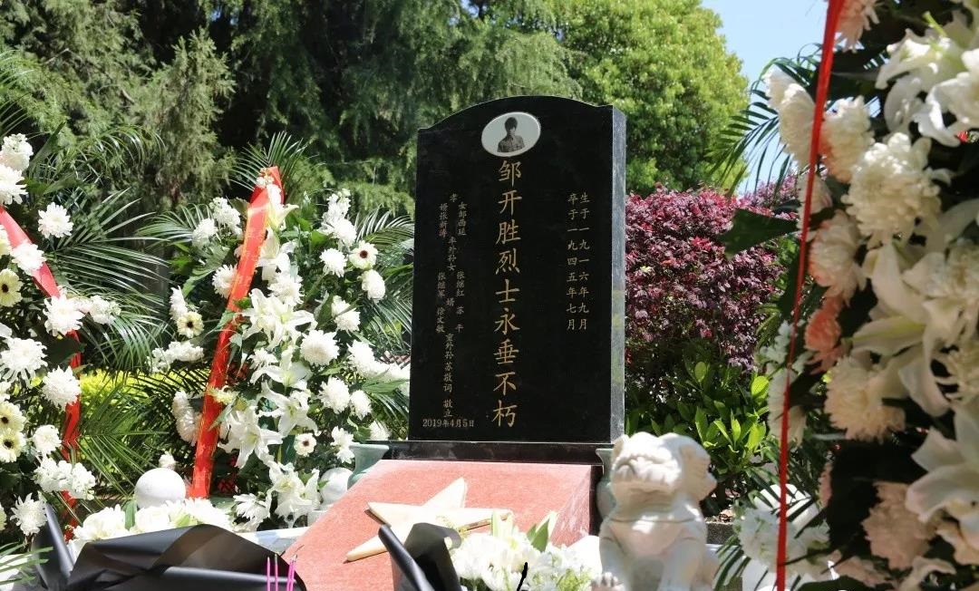 红安县档案馆馆长辛向阳说:“邹开胜曾经担任八路军总部特务团的政委。1945年7月,邹开胜从延安奉命到鄂豫边区工作,在途经山西平遥县城的时候同日军激战,一发炮弹的弹片把他的腹部割开了,当时肠子都流出来了,情急之下他就用一个搪瓷碗捂在伤口上面,然后用绷带绑着,行走了几十里路以后,因为伤势过重,牺牲在平遥县丰盛村。因为当时军情很紧急,部队就只好将他安葬在丰盛村旁边的一个石头山上,邹开胜牺牲的时候,他的女儿还没有出生。”