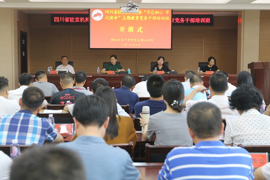 2019年6月10日下午15:00,四川省驻京机构党委"不忘初心 牢记使命”主题教育党务干部培训班在湖北红安干部学院大别山分院举行开班仪式,四川省人民政府驻京办机构党委书记袁敏出席开班式并作动员讲话,湖北红安干部学院副院王晓琴出席开班式并致欢迎词,湖北红安革命纪念地管理中心副主任、湖北红安干部学院大别山分院副院长张盛潮出席开班式。