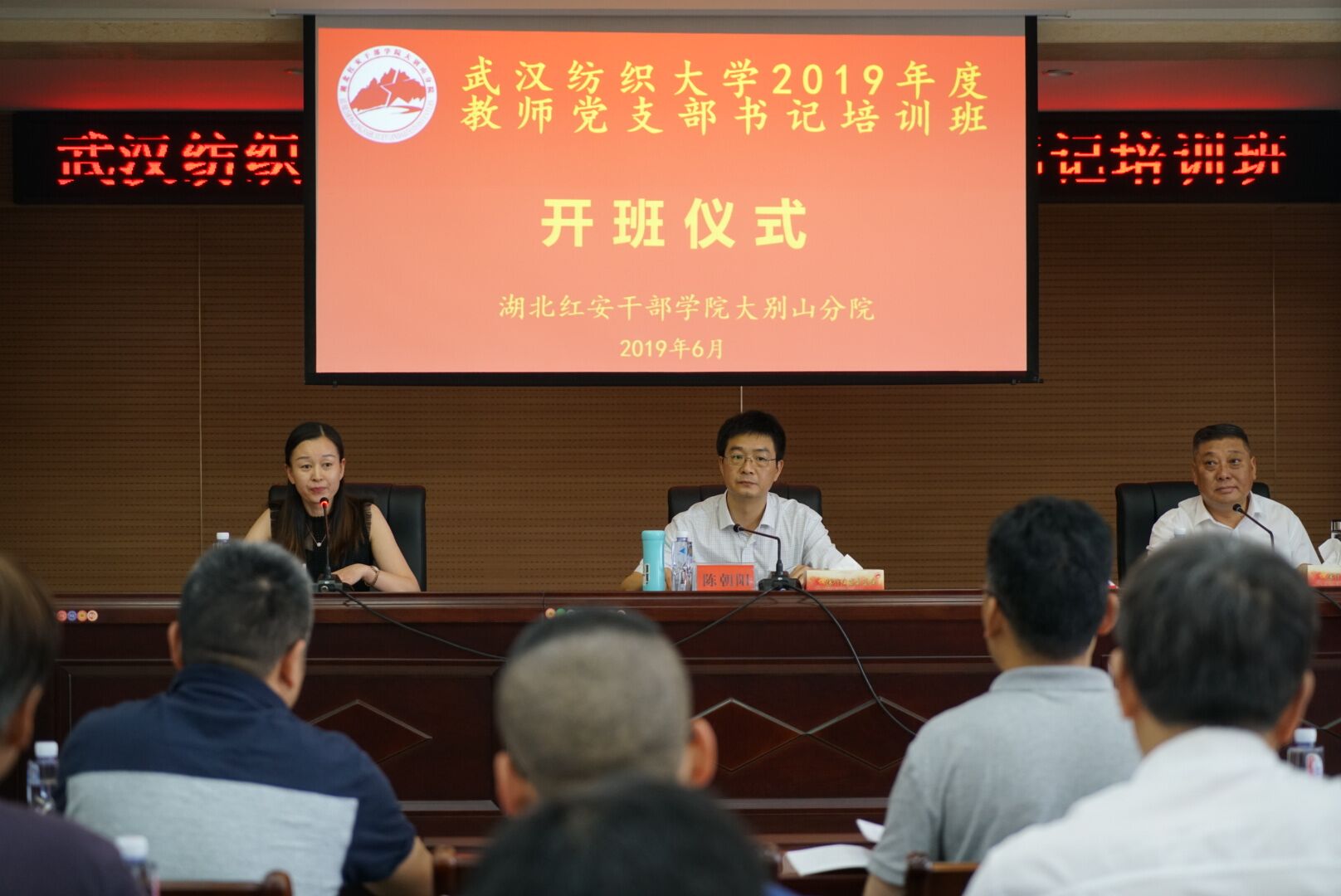 2019年6月13日上午,武汉纺织大学2019年度“双带头人”教师党支部书记培训班在湖北红安干部学院大别山分院顺利开班。武汉纺织大学党委组织部常务副部长陈朝阳出席开班仪式并讲话、湖北红安干部学院大别山分院副院长张盛潮出席开班式、武汉纺织大学党委组织部副部长秦红主持开班仪式。武汉纺织大学55名“双带头人”教师党支部书记参加了此次培训。