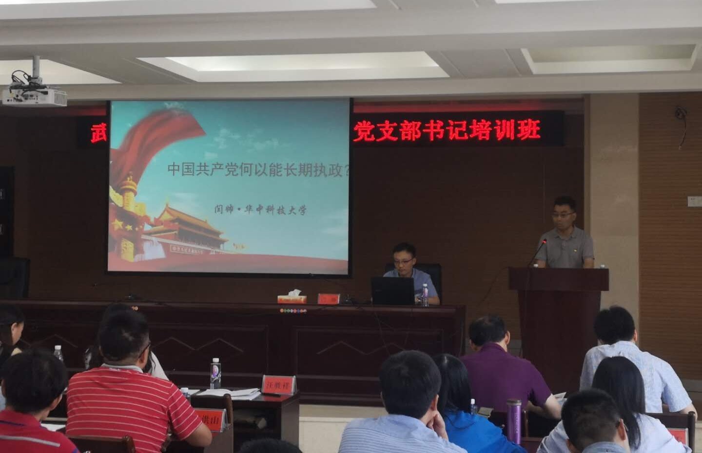 华中科技大学马克思主义学院闫帅副教授为培训班带来第一讲——“爆款”思政课《深度中国之中国共产党何以能长期执政?》。他围绕中国共产党为什么“能”、马克思主义为什么“行”、中国特色社会主义为什么“好”等重大问题,用大量数据史实、案例及对比,深入浅出地阐述了中国共产党何以能长期执政。