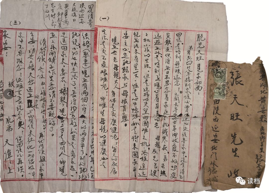 红安县档案馆藏张天伟抗战家书11封,是他于1937年3月至1942年7月随军驻扎陕西泾阳县云阳镇、甘肃庆阳县一二九师三八五旅司令部和在延安抗大学习时写给母亲、族叔、胞兄等人的,其中给母亲的6封、族叔张豪良2封、胞兄张天旺2封、舅爷1封。这些书信原本是由张天伟母亲藏在老家屋顶的瓦片下面。在上世纪70年代末期,张家人翻修老房子时无意间发现了这些珍贵的书信,后来由其子女于2017年3月移交至红安县档案馆。