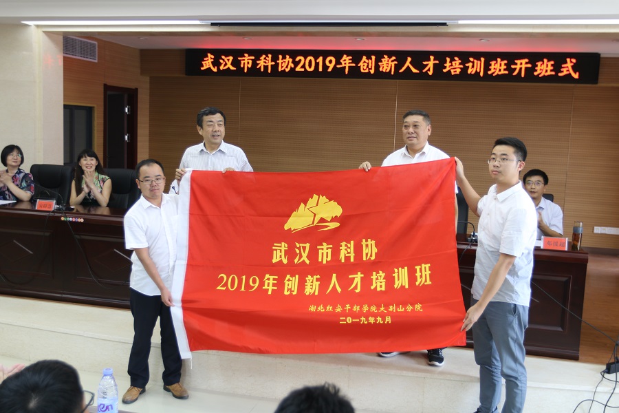 武汉市科协党组书记、副主席陈光勇,湖北红安干部学院大别山分院副院长张盛潮对市科协2019年创新人才培训班开班表示热烈的祝贺,安群慧宣读六条培训纪律,对于如何办好创新人才培训班,熊少明提出三点意见:一是充分认识和把握此次培训的目的和意义;二是增强责任感、使命感,做好新形势下的企业技术创新工作;三是强化学习,积极投身实践。最后,武汉市科协党组书记、副主席陈光勇,湖北红安干部学院大别山分院副院长张盛潮一起为学员代表授旗。