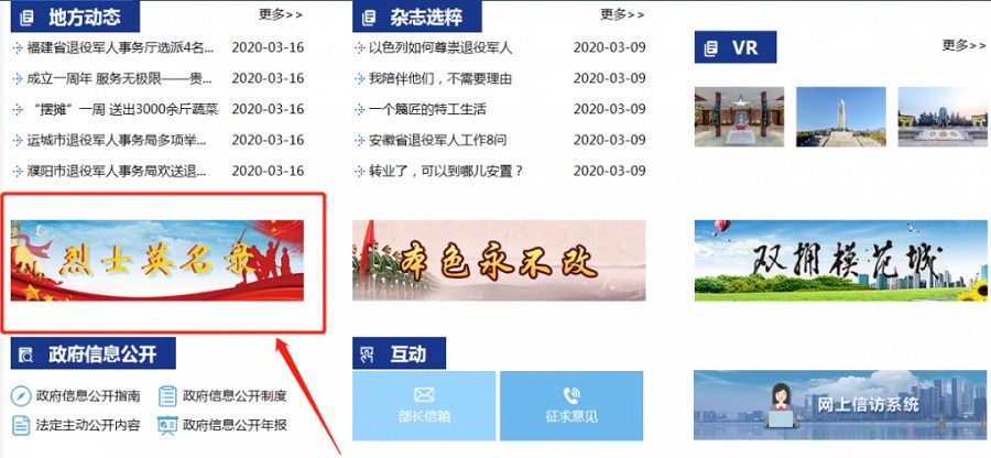 ➤ 输入网址(http://www.mva.gov.cn)进入中华人民共和国退役军人事务部官网,点击进入烈士英名录。